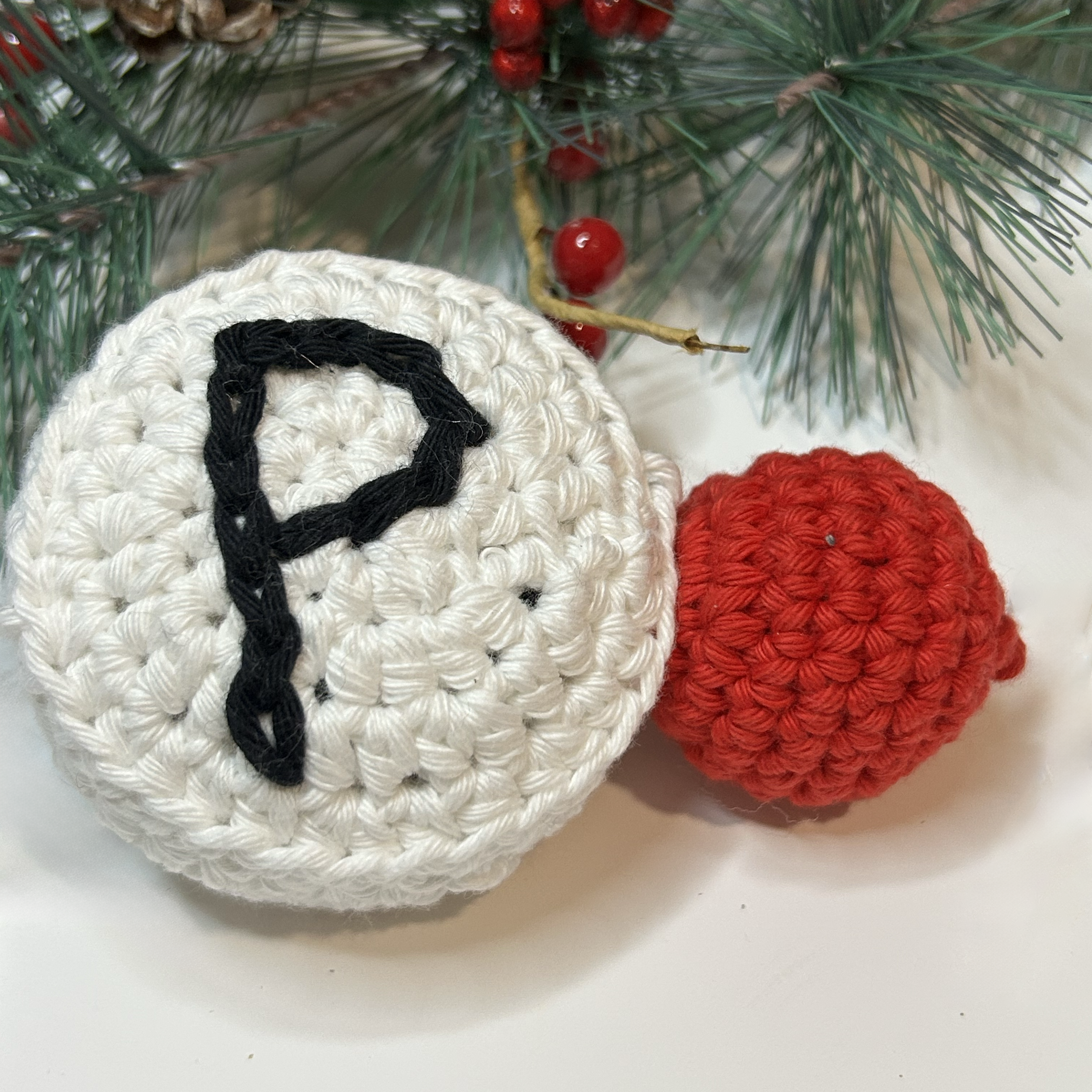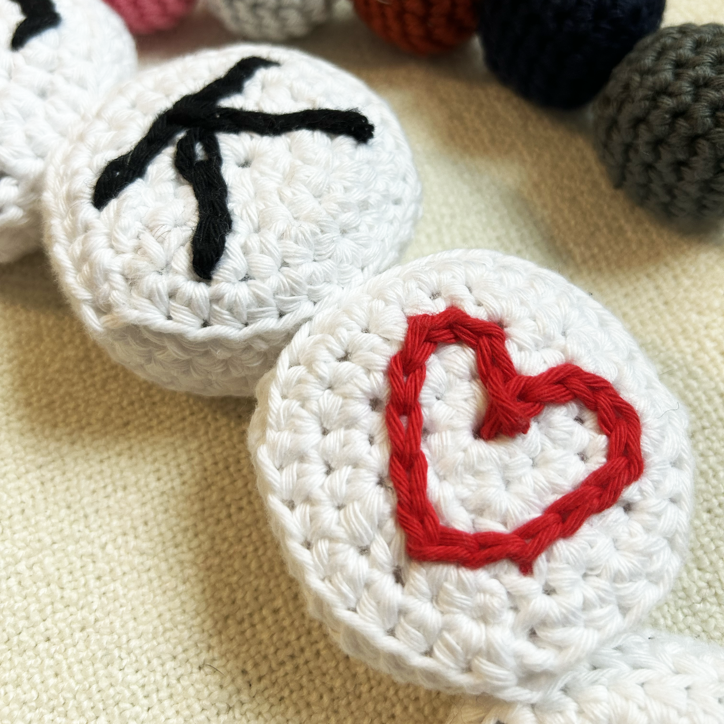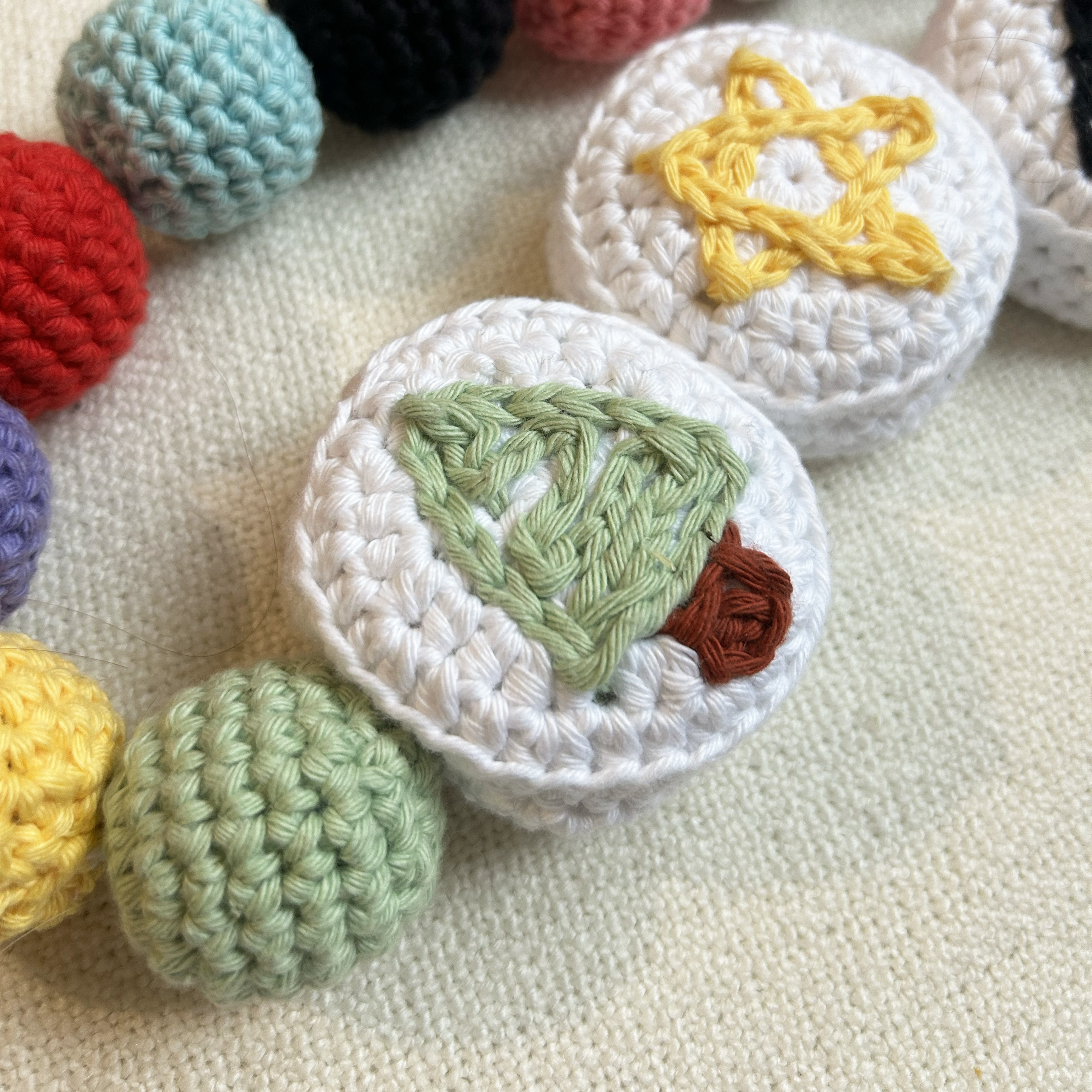 You can use surface crochet or a simple embroidery stitch to put your letters on the beads. See the PDF for how I recommend doing each letter. - PDF is incoming once my design software stops being a dick...