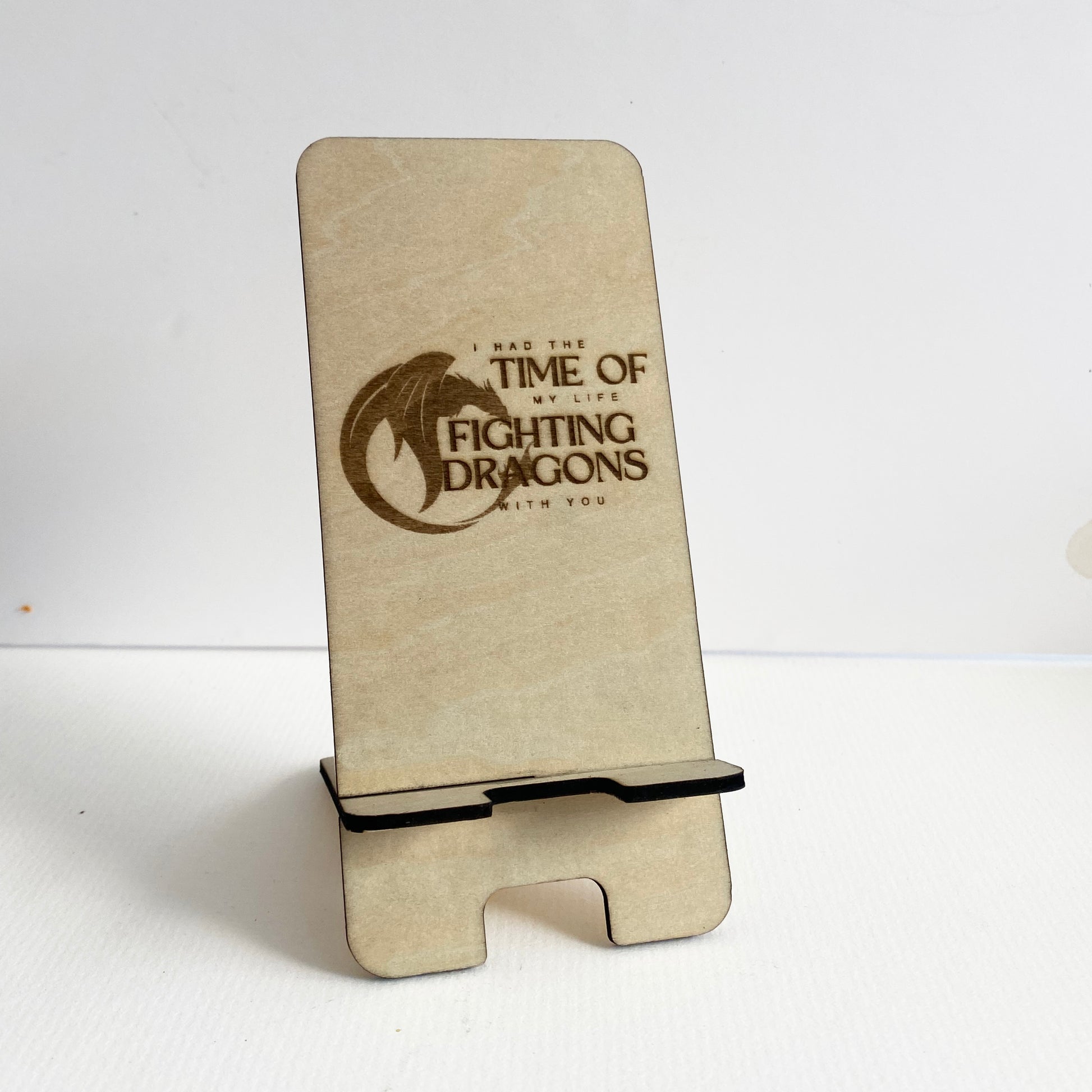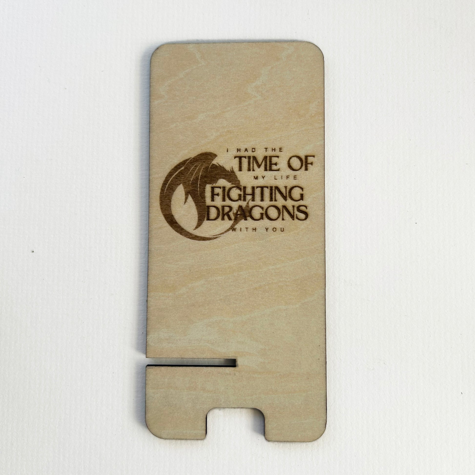Bring a touch of magic to your desk with the Fighting Dragons Phone Holder. Crafted from 3mm basswood or cherrywood, this laser-engraved stand features the enchanting lyrics "I had the time of my life, fighting dragons with you" alongside whimsical imagery inspired by Taylor Swift’s Long Live.