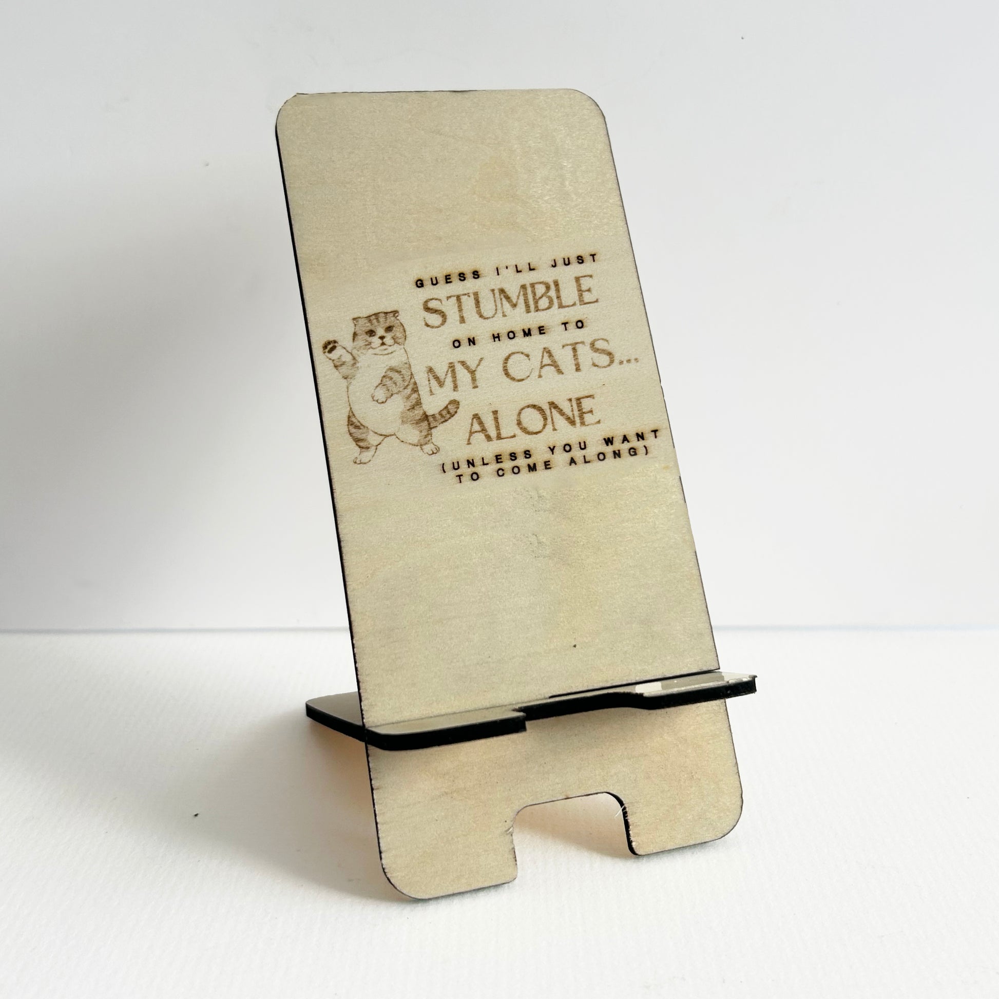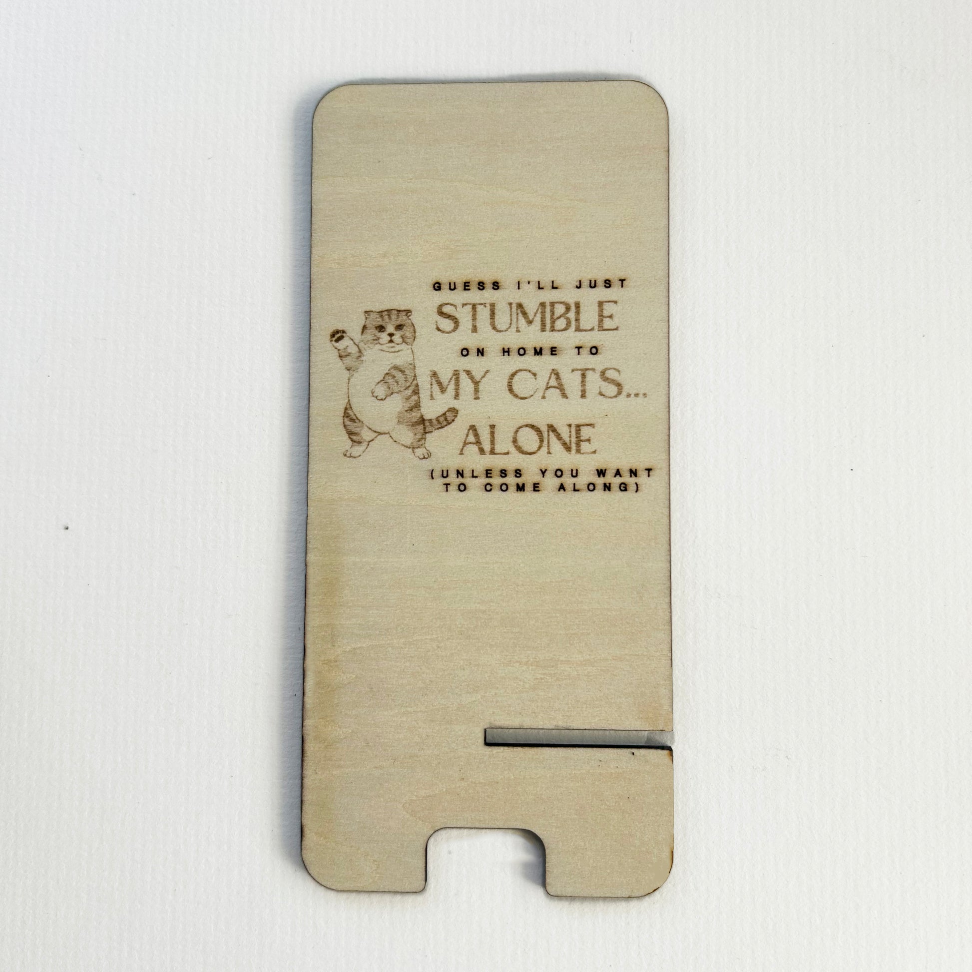 Bring a touch of magic to your desk with the My Cats Phone Holder. Crafted from 3mm basswood or cherrywood, this laser-engraved stand features the playful lyrics "I guess I'll just stumble on home to my cats... alone... unless you want to come along" alongside whimsical imagery inspired by Taylor Swift’s Gorgeous.