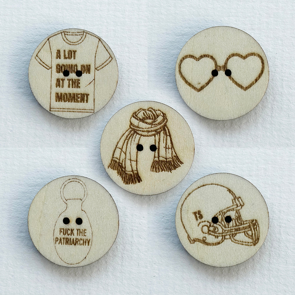 Crafted from your choice of sturdy 3mm basswood or cherrywood, each set includes five unique designs inspired by her iconic style.