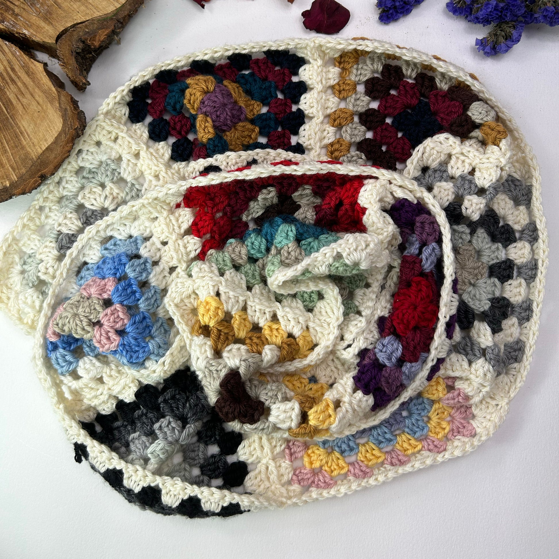 Each Granny Square scarf kit contains everything you need in order to complete your scarf kit, including a stitch guide and video tutorials.